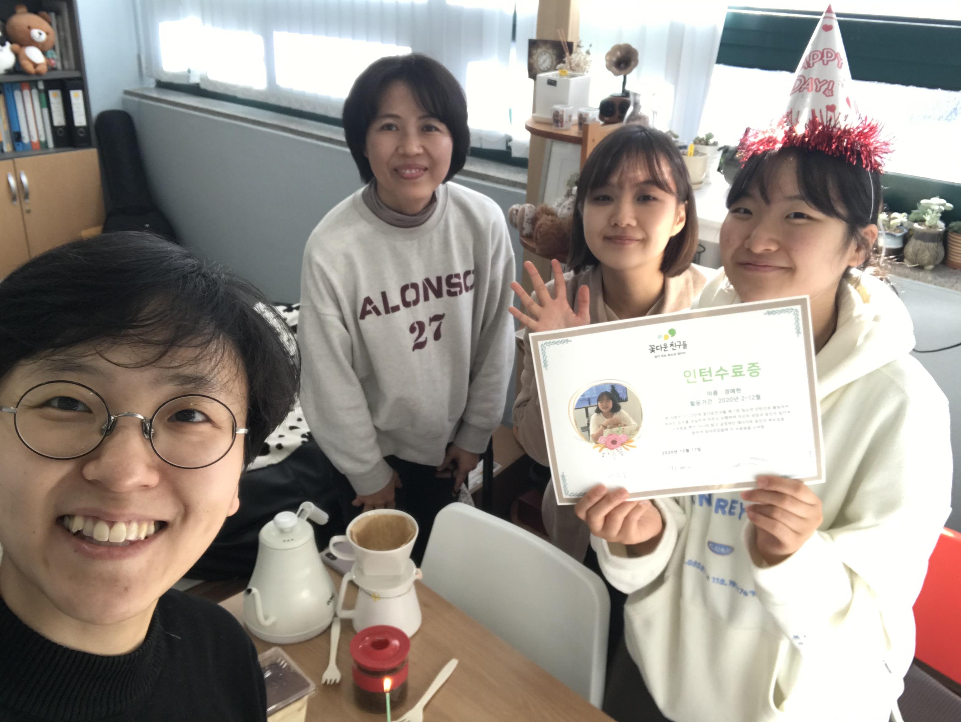 점심으로 떡국을 먹고 오후가 시작되었다. 글을 마무리하고 글에 넣을 사진도 편집했다. 글은 예지쌤께서 SNS에 올려주셨다. 글쓰기가 끝난 뒤 엘리베이터 앞 게시판에 넣을 종이를 꾸몄다. '꽃다운친구들' 여섯 글자를 여러 방법으로 꾸밀 수 있어 재밌었다. 또한 대원이의 색연필이 매우 유용하게 쓰이고 있다는 사실ㅋㅋ 대원아 고맙다~ 이렇게 인턴일지까지 쓰고 나니 벌써 끝날 시간이다. 흐흐흐 오늘의 인턴일지 끝!