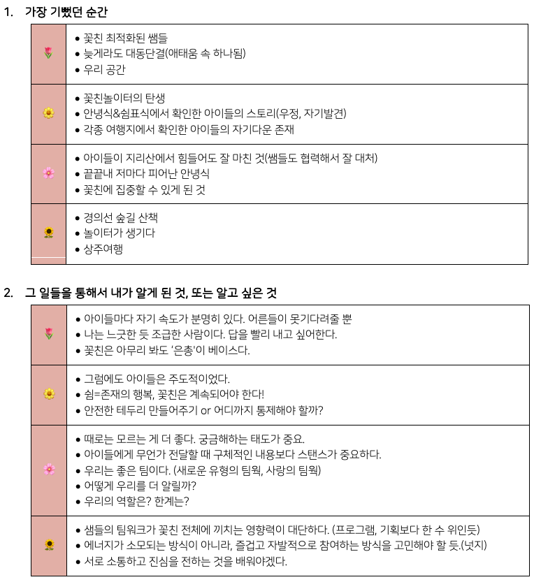 다음 날 아침에는 지난 밤에 나누었던 이야기들을 토대로 올해 꽃친에서 이루어지기 바라는 것을 적어보았습니다.