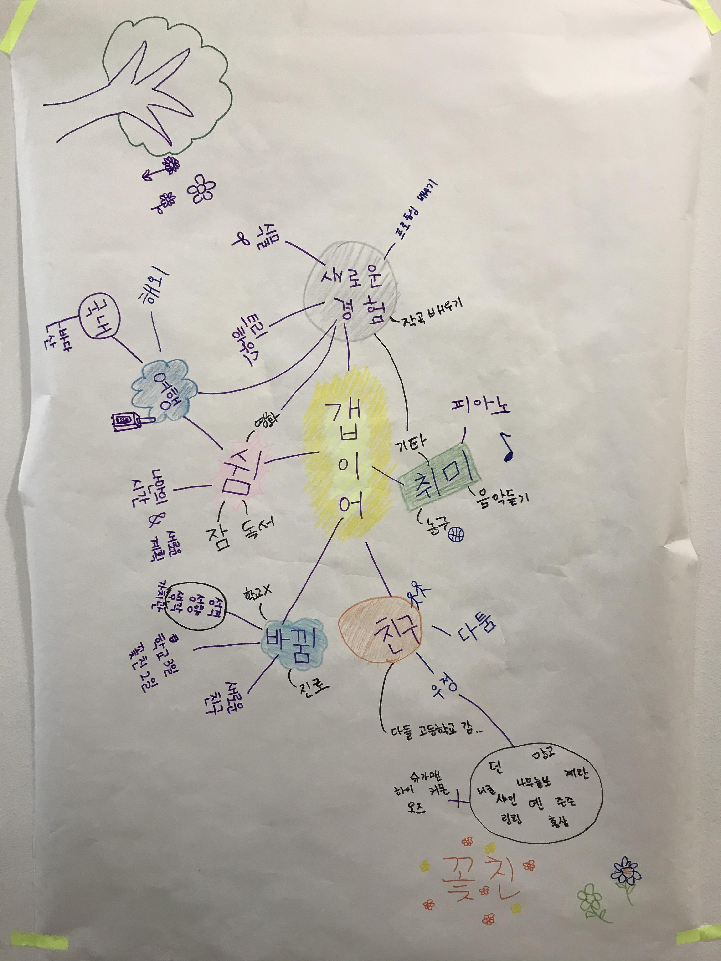 오후에는 꽃친에 대해서 좀 더 알아가는 시간을 가졌어요. 커몬이 준비한 '꽃친의 의미와 전세계의 청소년 갭이어' 발표를 듣고 나서 조별로 갭이어라는 키워드를 가지고 마인드맵을 그려 보았습니다. 6기 꽃치너들이 생각하는 갭이어는 어떤 것일까요?
