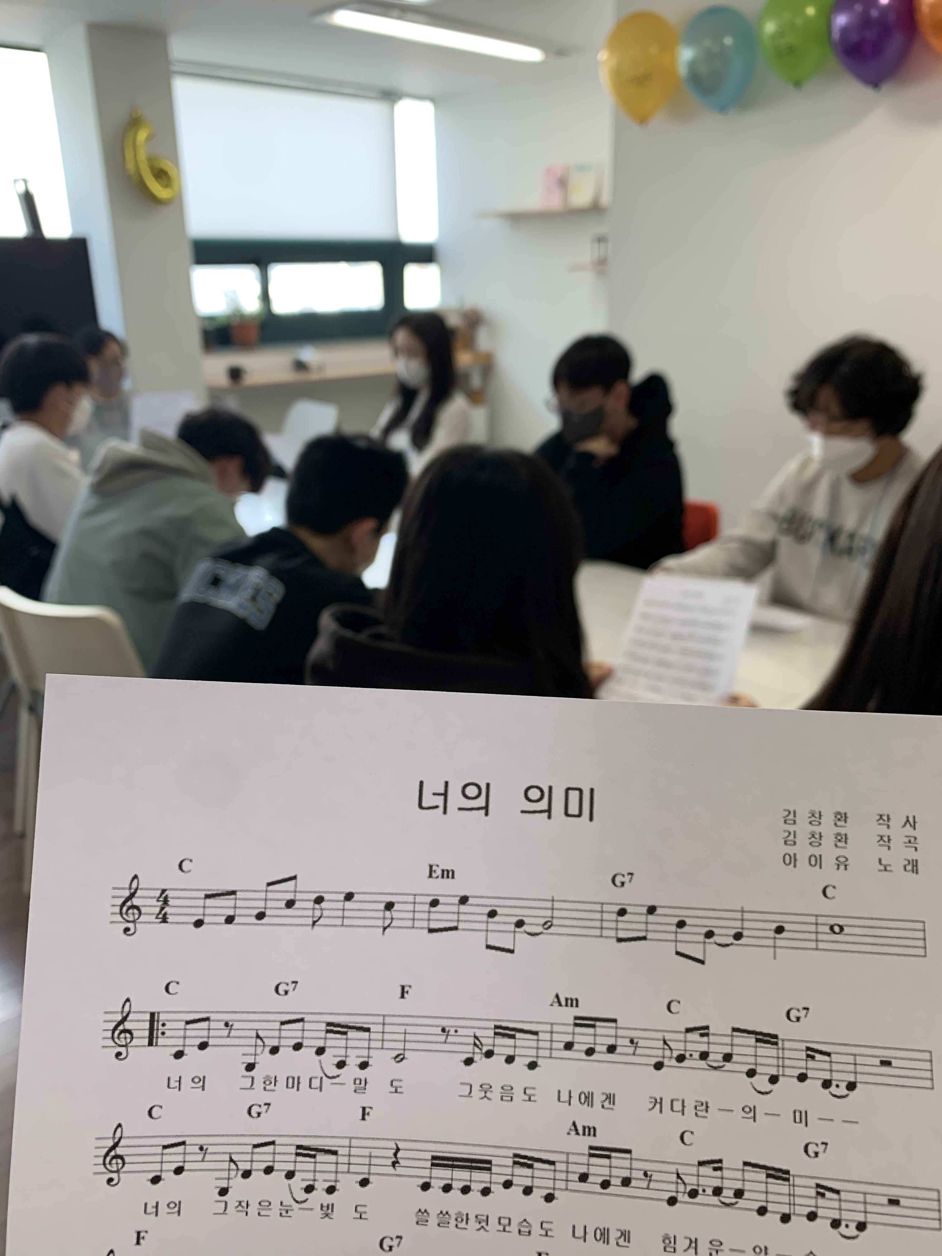 6기부터는 야심차게 키보드도 마련했습니다. 그리고 오티 때부터 싱어롱을 했지요. 무리한 것을 시도하기 보다는 한 번에 한곡을 같이 불러보고 있습니다. 이제까지 함께 불렀던 곡은 아이유의 '너의 의미', 오연준의 '쉼의 필요해', 옥상달빛의 '어른이 될 시간', 김동률의 '출발', 이적의 '걱정말아요 그대'입니다.