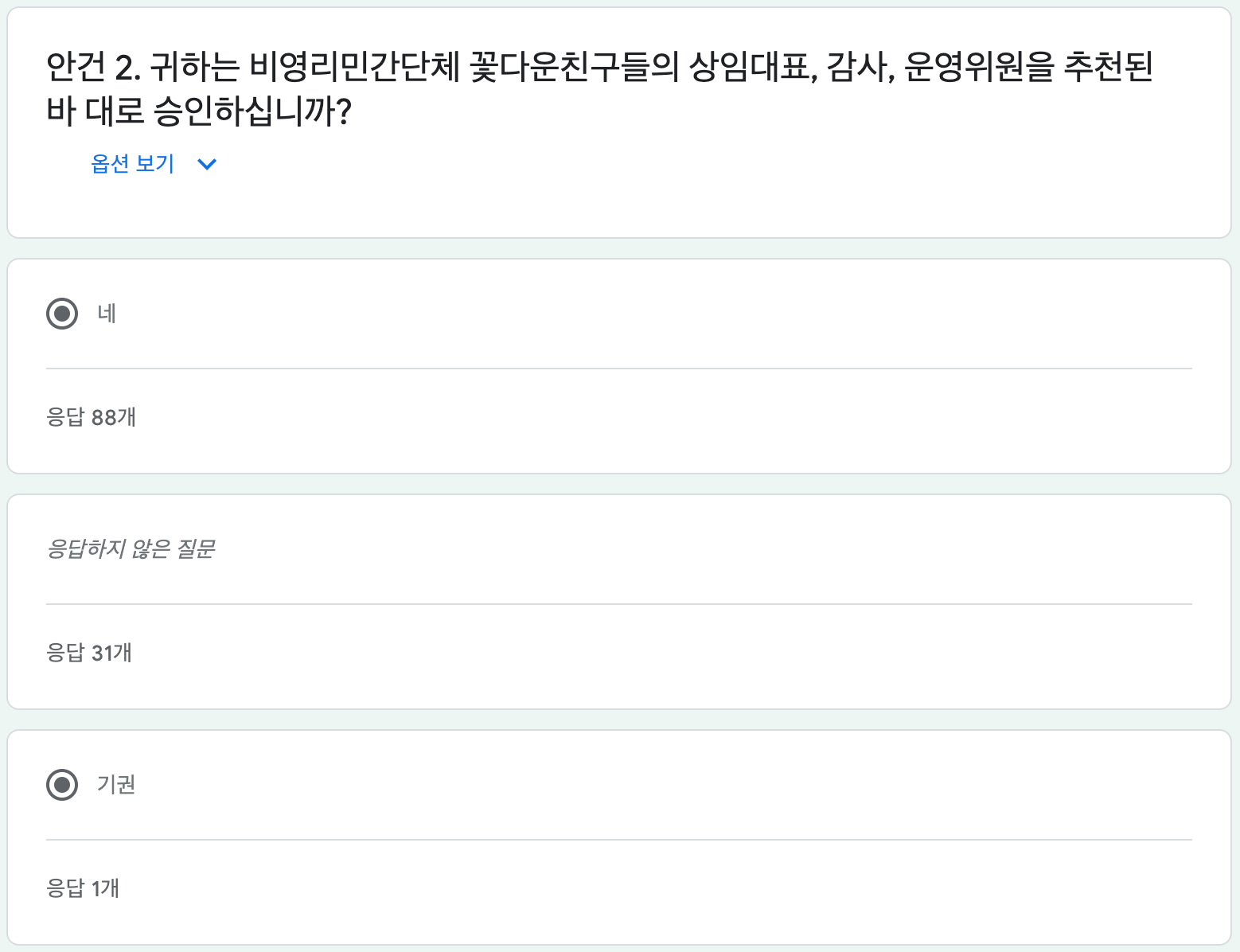 (투표자 중 2명이 총회에 중복참여 했고, 모든 안결에 찬성으로 투표하였으므로 캡쳐에서 보이는 찬성 표에서 2표를 빼고 기록함.)