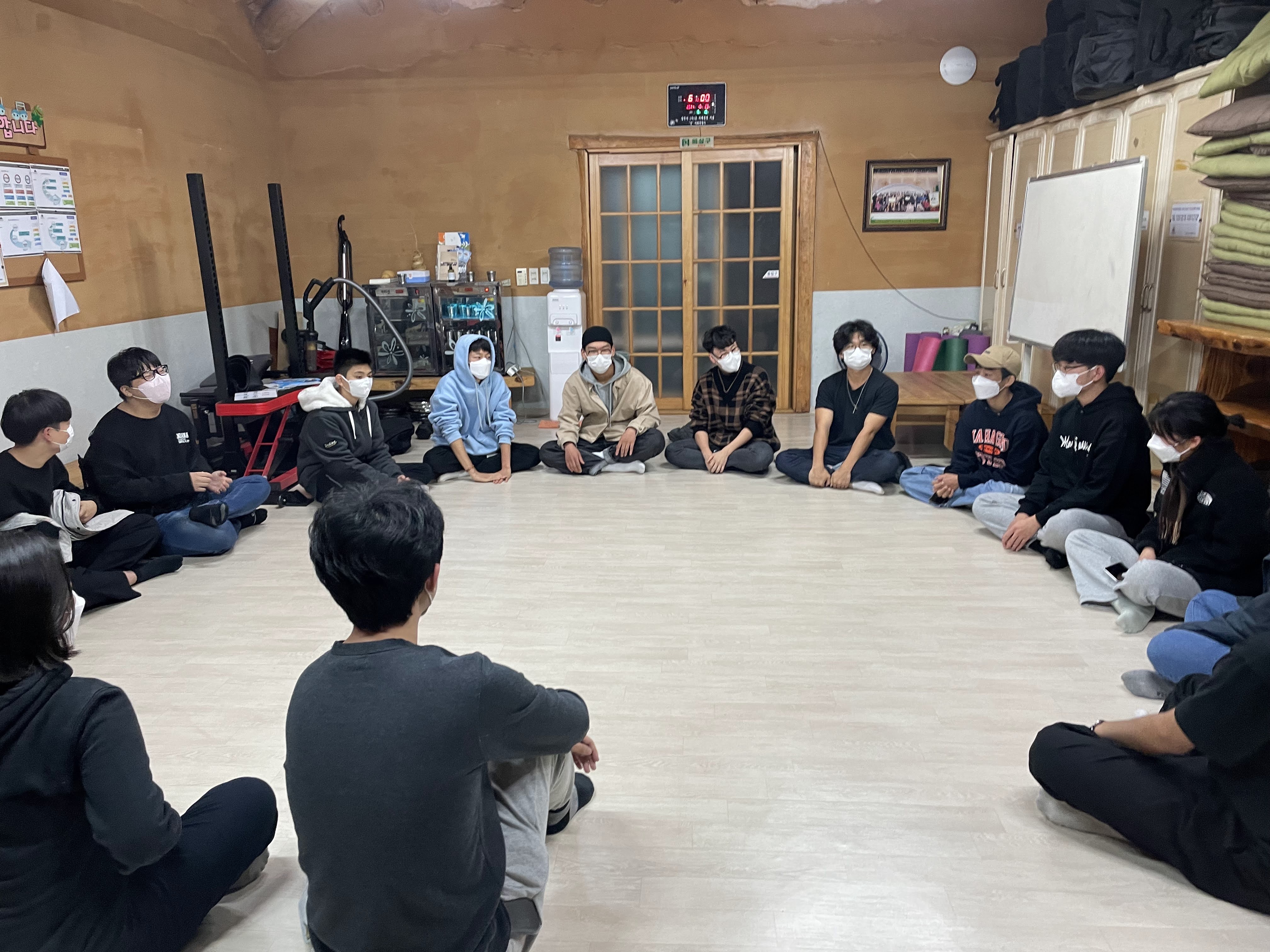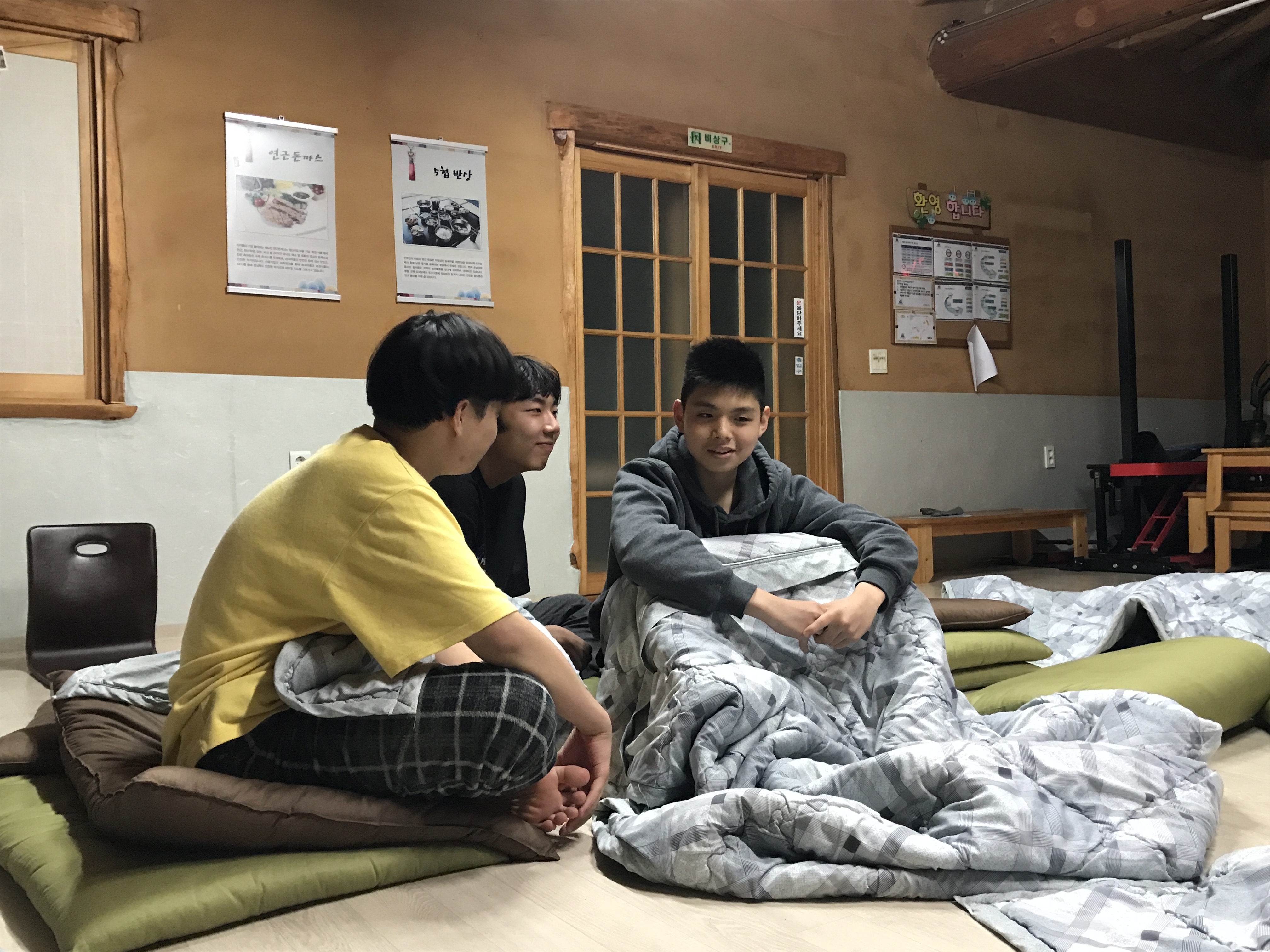 바로 밤샘 수다입니다. 의자, 방석, 이불까지 모두 동원해서 식당을 아지트로 점령한 뒤 밤과 새벽이 올 때까지 이번 여행에 대해, 이제까지의 꽃친 생활에 대해, 서로에 대해 평소에 하지 못했던 이야기들을 모두 꺼내놓았어요. 너무너무 졸리지만 졸린 눈을 비벼가며, 때로는 졸다가 다시 일어나서 참여하기도 하며 지나가는 것이 아까운 소중한 시간을 누렸답니다.
