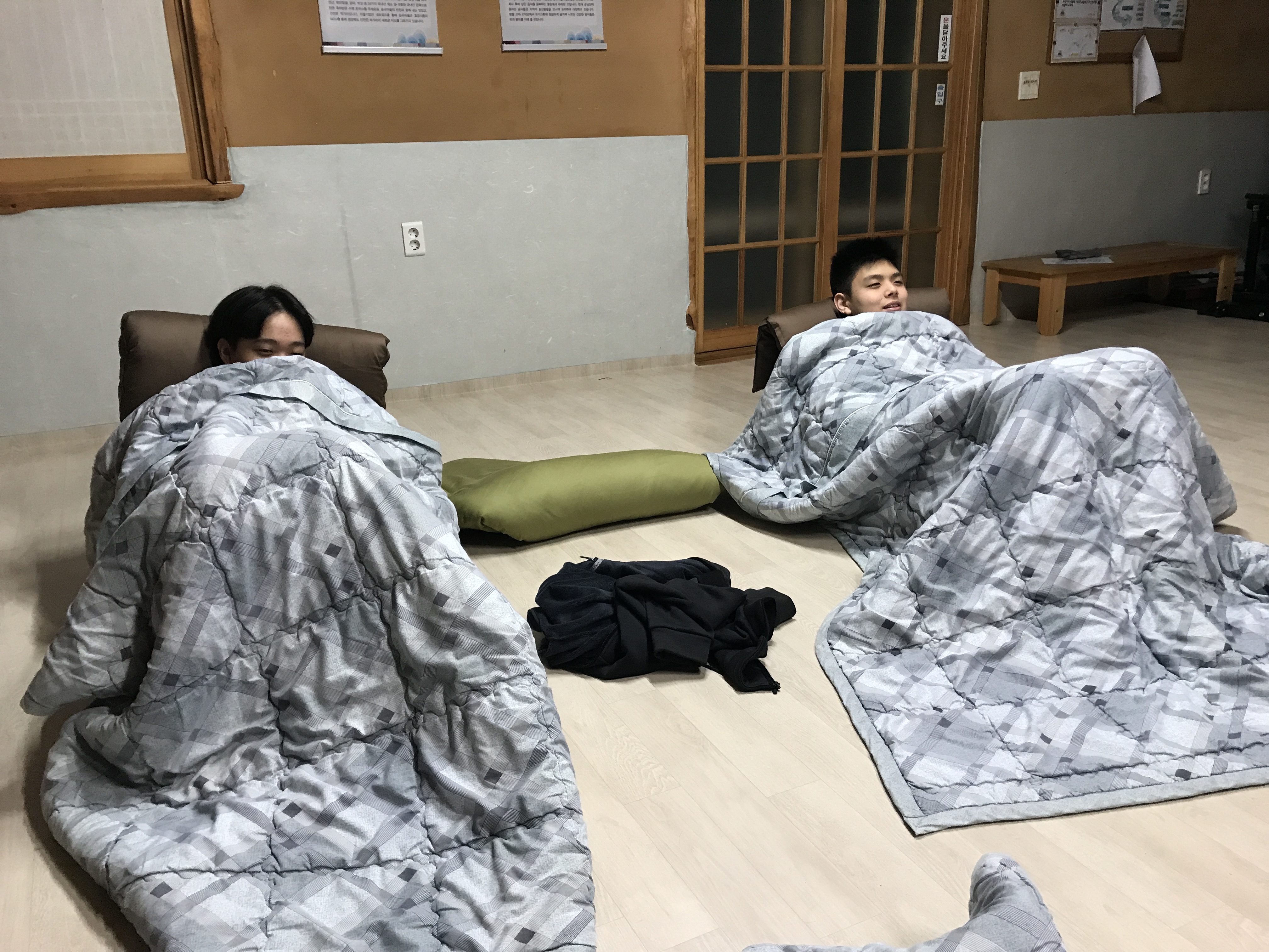 바로 밤샘 수다입니다. 의자, 방석, 이불까지 모두 동원해서 식당을 아지트로 점령한 뒤 밤과 새벽이 올 때까지 이번 여행에 대해, 이제까지의 꽃친 생활에 대해, 서로에 대해 평소에 하지 못했던 이야기들을 모두 꺼내놓았어요. 너무너무 졸리지만 졸린 눈을 비벼가며, 때로는 졸다가 다시 일어나서 참여하기도 하며 지나가는 것이 아까운 소중한 시간을 누렸답니다.