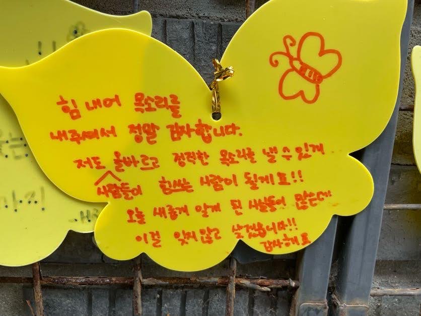 🦋 전쟁에서 우리나라뿐 아니라 다른 여러 나라의 피해도 있다는 것에 놀랐다. 우리 나라도 똑같이 잘못했다는 것이 충격이고 크게 와닿았다. 전시를 통해 새롭게 알게 된 것이 많다. 처음 목소리를 내서 세상에 알린 할머님이 대단하다고 생각되고, 감사하다.