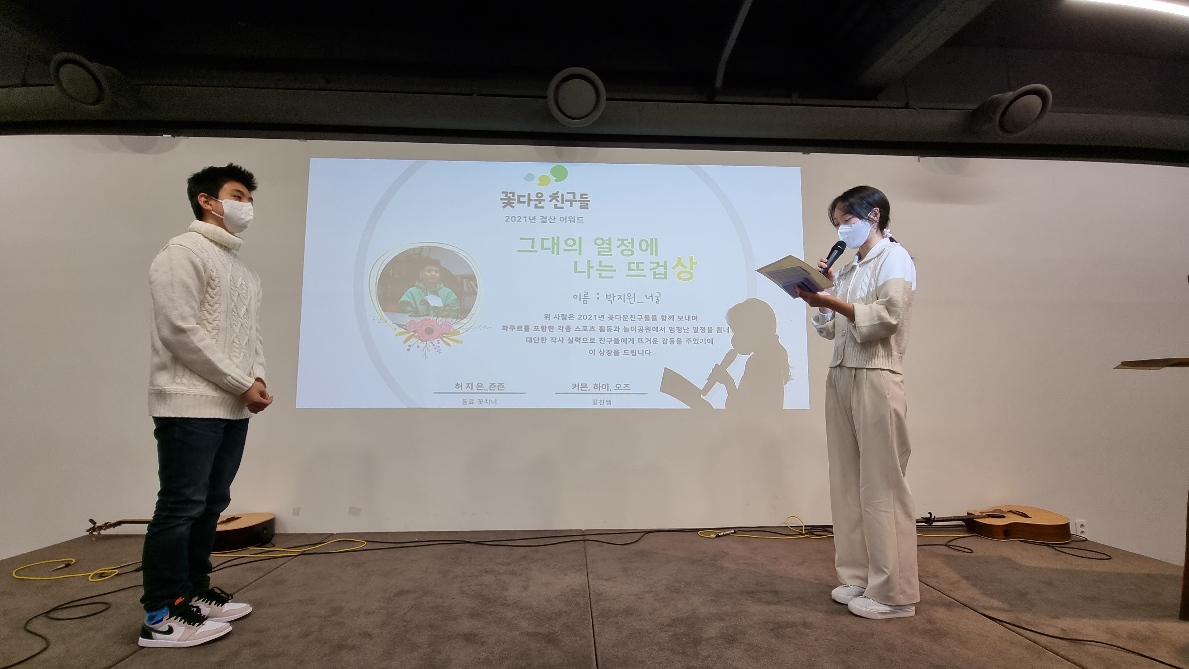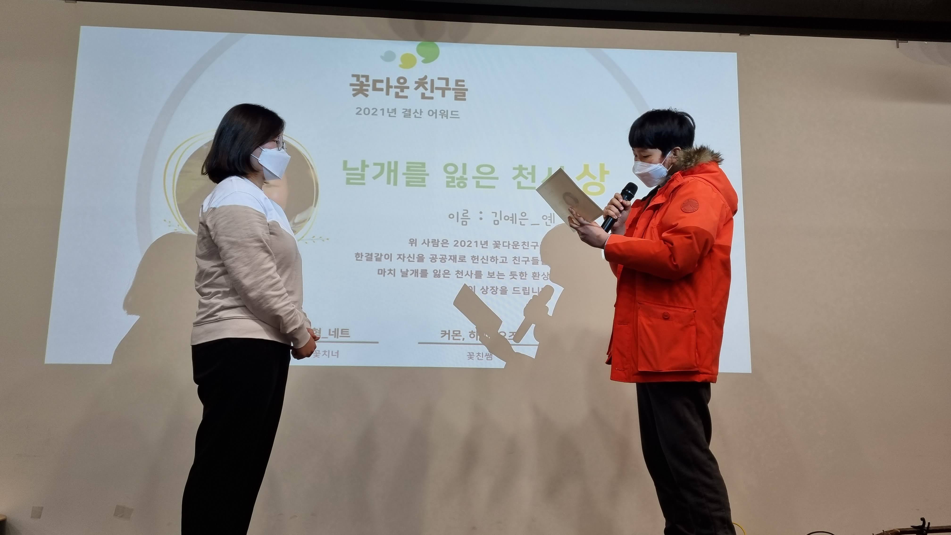 매년 빠질 수 없는 꽃친 안녕식만의 특별한 시간이죠. 연예대상 부럽지 않은(!) 꽃친어워드 시간입니다. 꽃치너들이 서로 알고 있는 고유한 모습을 찾아 칭찬하고 상을 만들었어요. 친구를 위해 만든 상장인 만큼 꽃치너들끼리 릴레이로 시상했습니다.