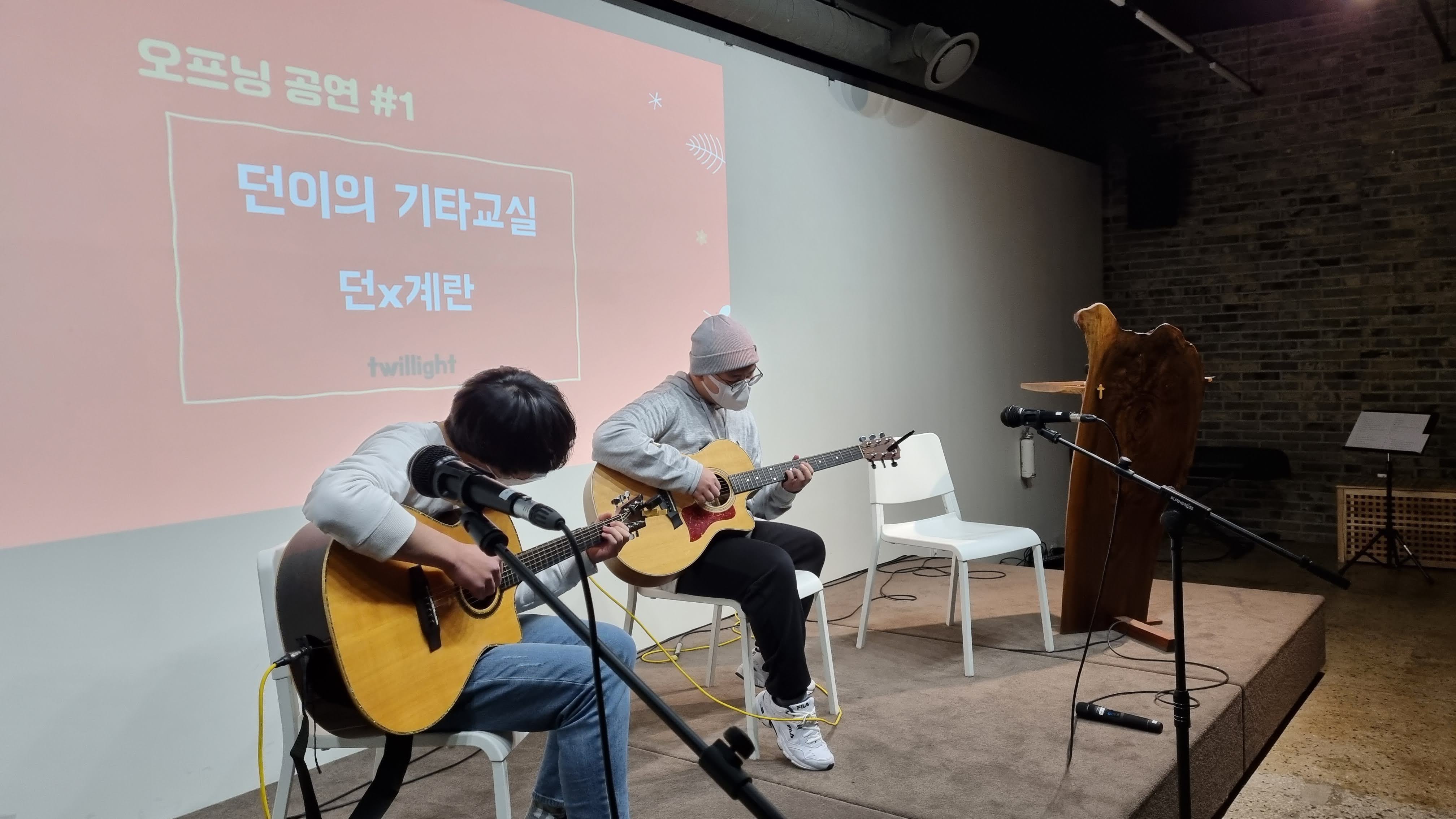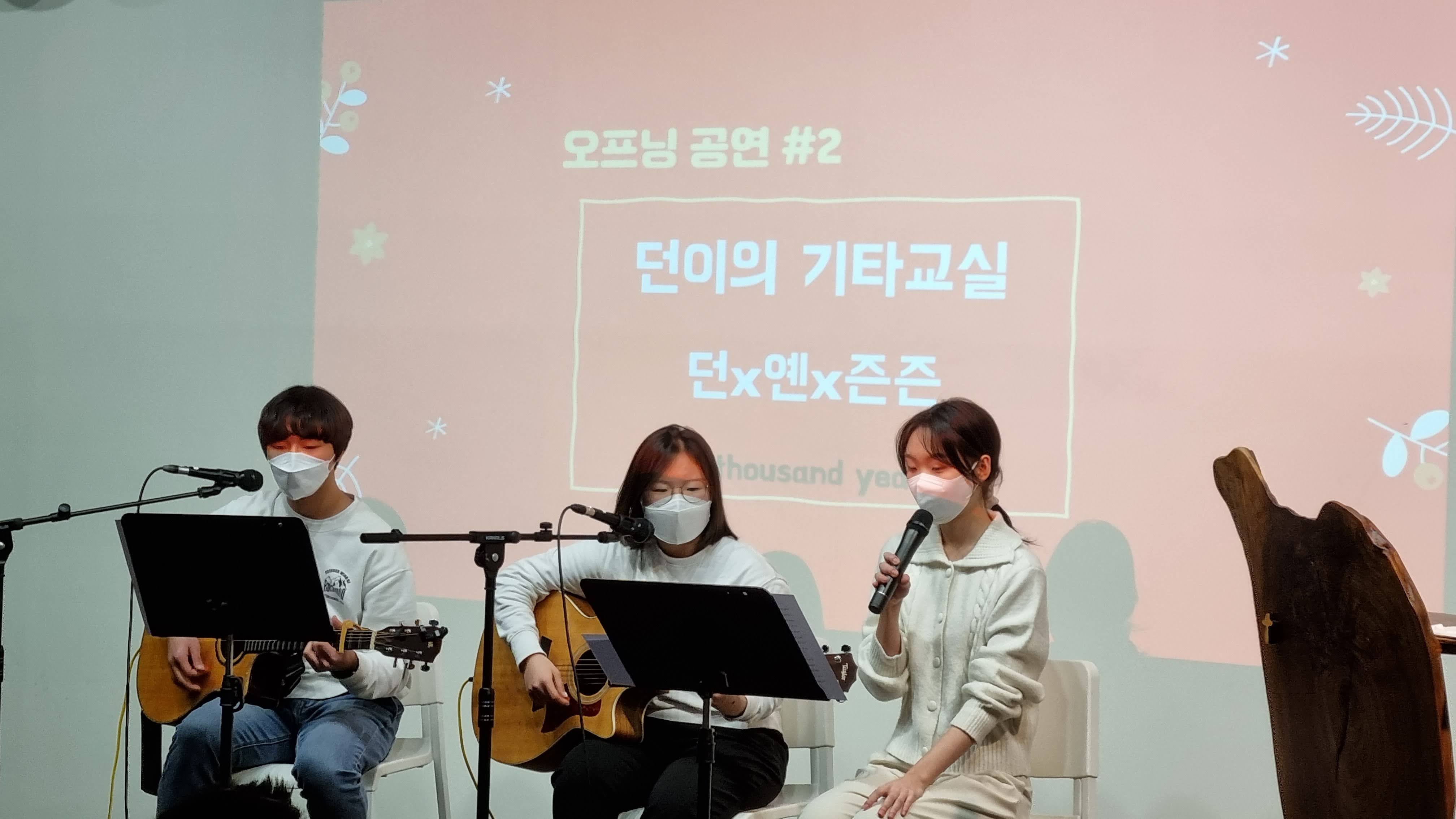 팀이름이 '던이의 기타교실'이라서 진짜 기타수업을 운영했나 생각할 텐데 던이의 기타교실은 6기 꽃치너들만의 비공식 시간(?)이었답니다. 상반기부터 던이가 친구들에게 기타를 가르쳐주고, 연습하면서 시작되었어요. 꽃친 놀이터에서의 점심시간마다 기타 소리가 끊이질 않아서 꽃친쌤들이 "안녕식에 공연해야겠다"라고 했던 말이 현실로 이뤄진 날이었죠.