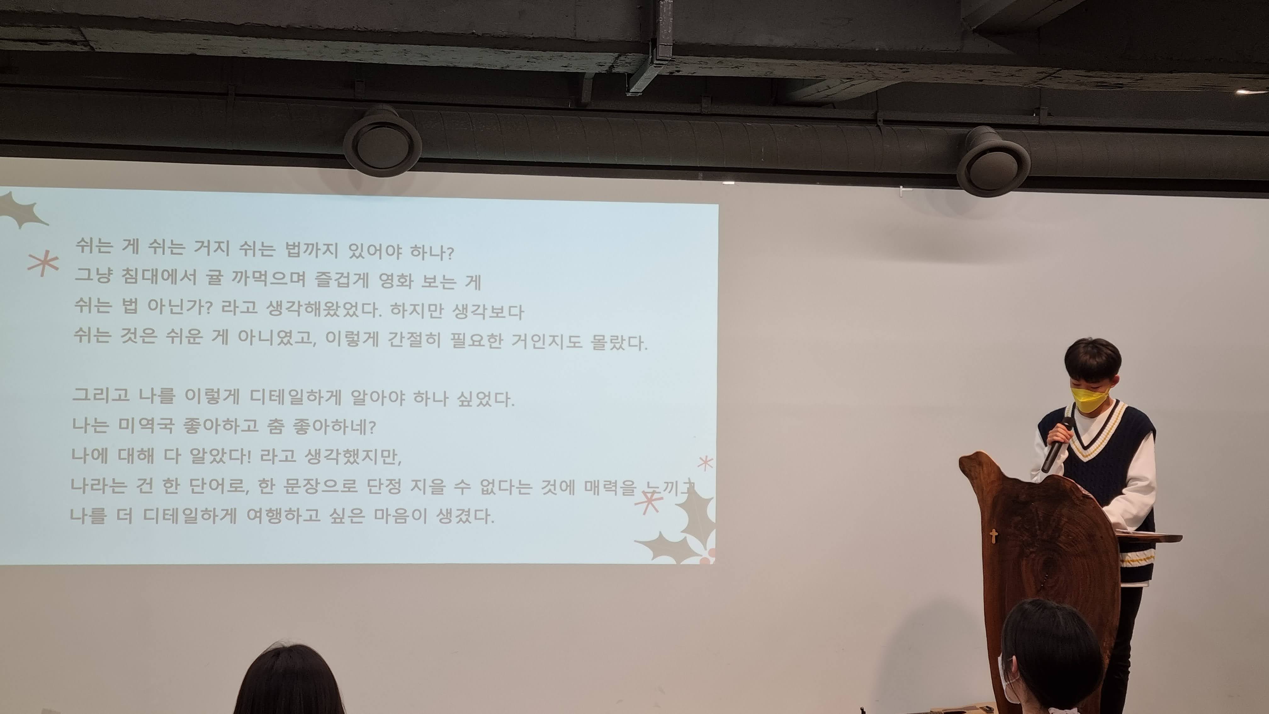 '꽃친을 하며 느낀 것들, 친구들에게 하고 싶은 말, 갭이어 동안 알게 된 나만의 쉬는 법' 등 한 해를 돌아보며 정리하는 생각을 담은 글을 발표하는 시간입니다. 아이들의 글 속에서 1년 동안 가꿔온 친구들과의 우정, 자신과 세상에 대한 작은 깨달음들을 엿볼 수 있었습니다.