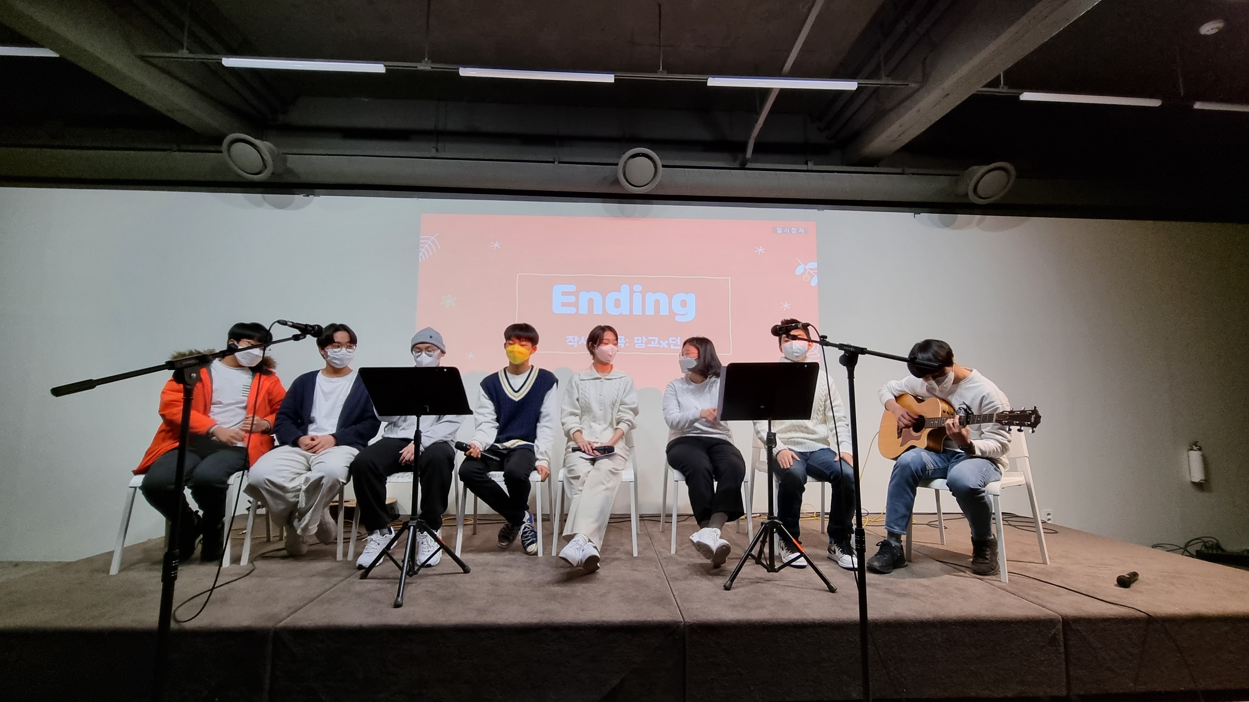 첫 곡은 Ending. 하반기 개인프로젝트에서 망고와 던이가 공동 작사, 작곡한 곡이에요. 꽃친을 마무리하고 새로운 시작을 앞둔 친구들에게 하고픈 말이 담긴 곡입니다. 무대에 나가는 것이 낯간지럽다고 했던 친구들도 함께 앉아서 작별의 노래를 부르는 모습이 짠하기도 하고, 멋졌답니다.